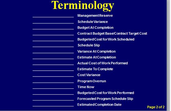 Check back for the next installment in two weeks for the correct terminology and for a brief description on what they mean in managing your programs. Earned Value: Fun with Numbers or Real Management Data – Answers (Part 2)